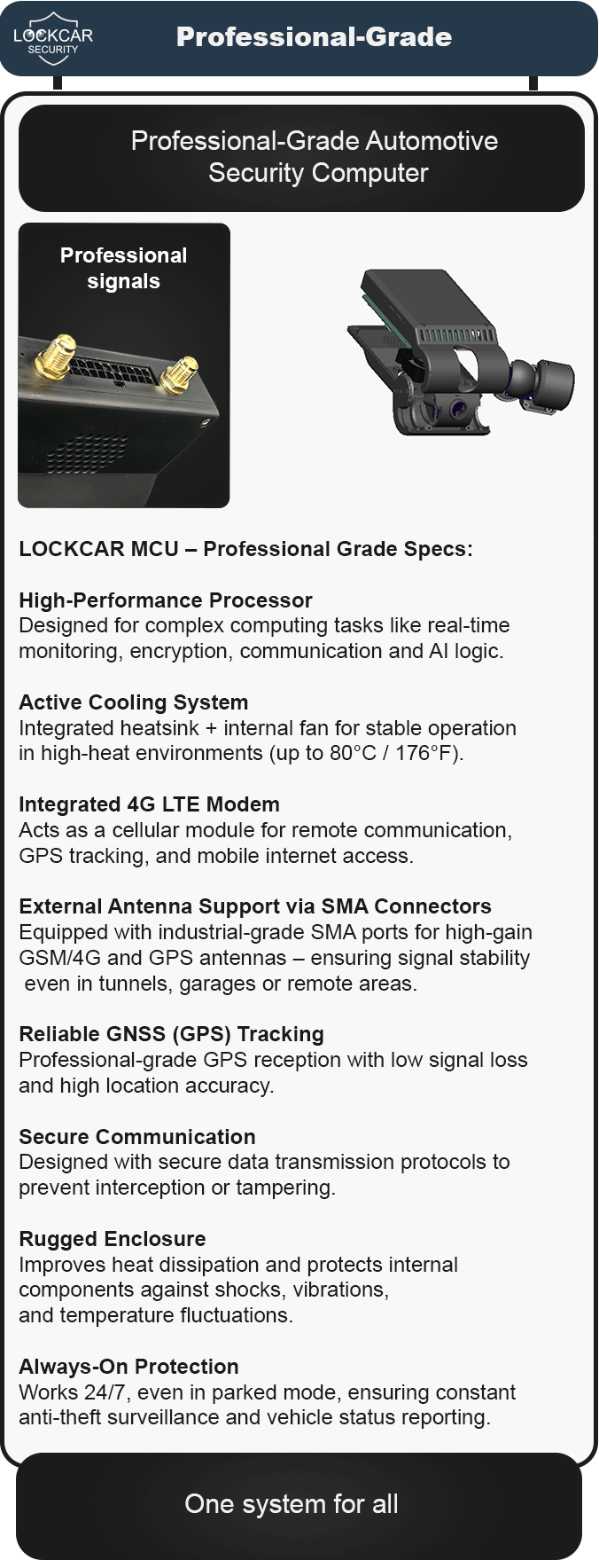 LOCKCAR MCU is built to operate reliably in temperatures up to 80°C (176°F).